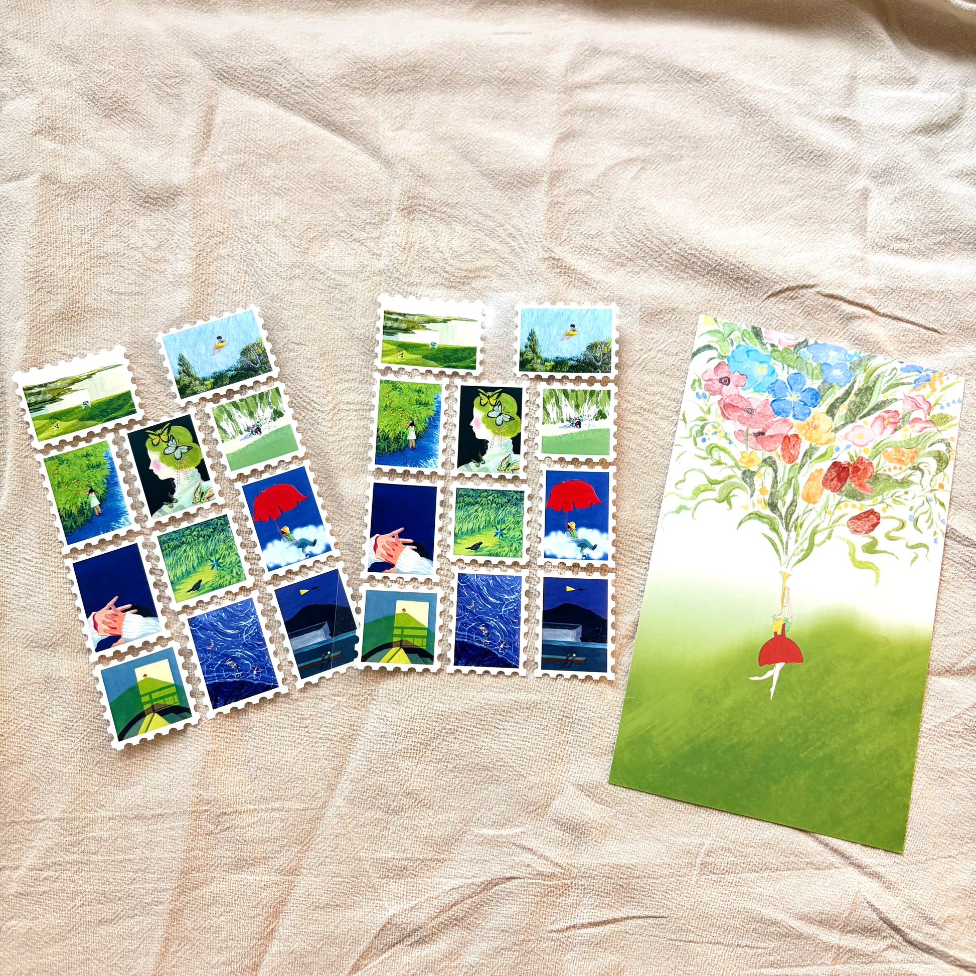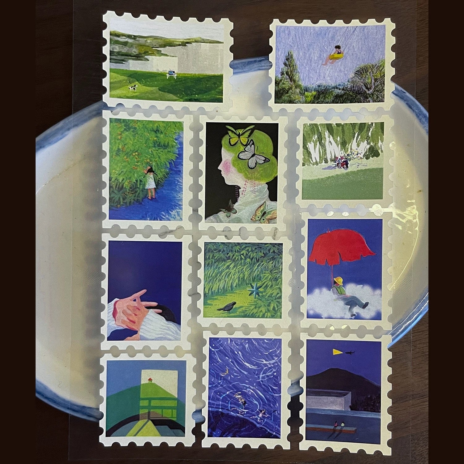 This sticker sheet features 12 stamp-inspired designs, each illustrated with a dreamy, storybook-like scene — from sun-dappled forests and gentle rivers to soaring red umbrellas and butterfly-haired girls.