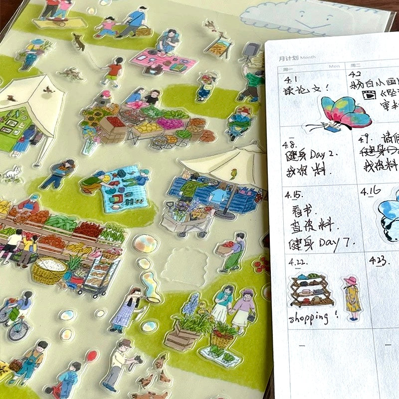 This illustrated sticker series captures the gentle rhythm of everyday life across the four seasons. From the lively buzz of spring markets and sunny summer gardens to the golden stillness of autumn and cozy winter festivities, each sheet is filled with charming vignettes and tiny discoveries.